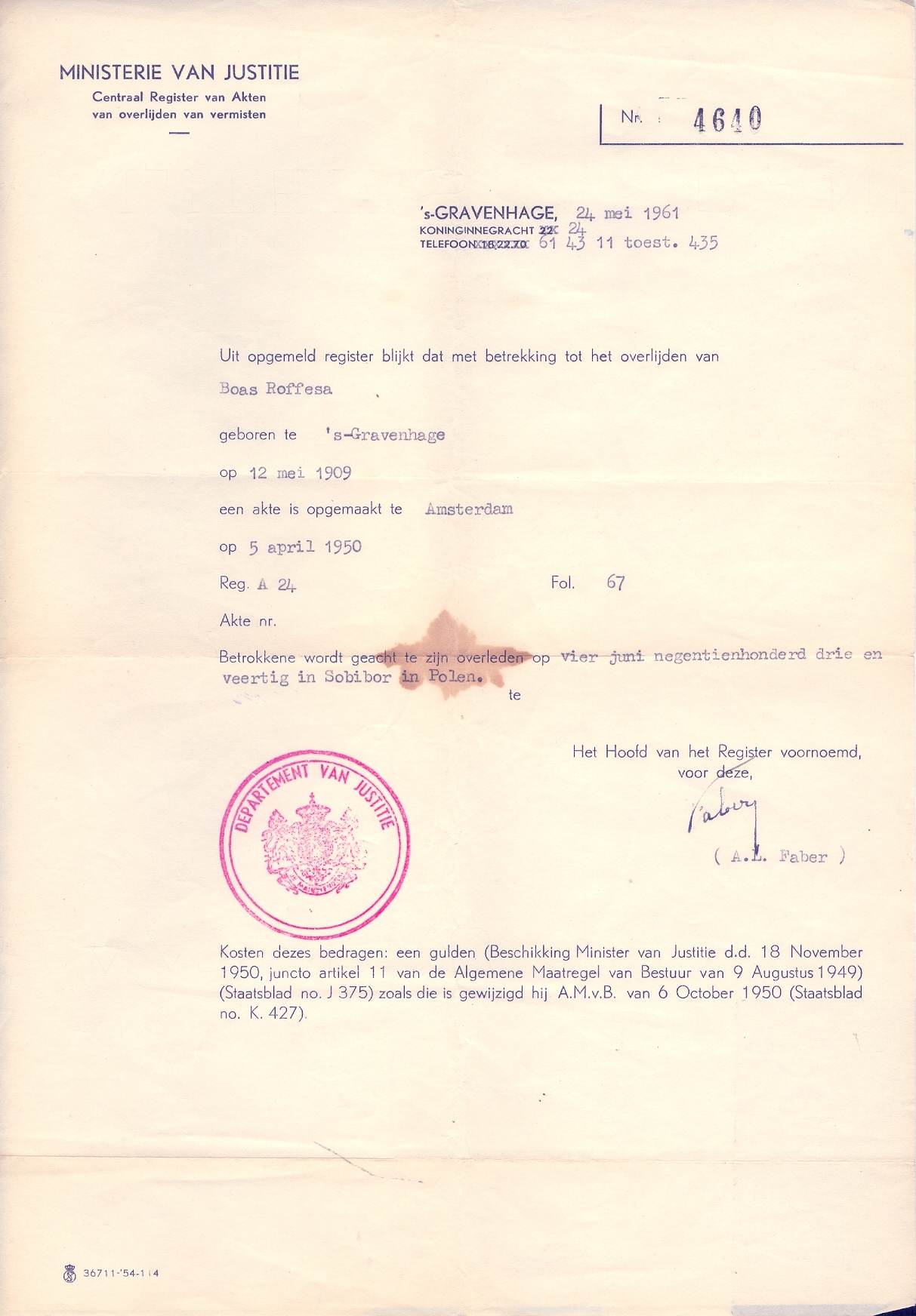 Isaac Roffesa (Rofessa) Geboren: 16 april 1902 25 23 — 's-Gravenhage (Z-H) Overleden: 31 augustus 1943 — Midden-Europa |
